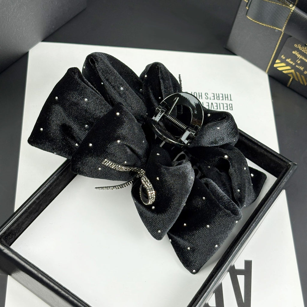 This hair clip embodies modern femininity — inspired by classic French chic and contemporary street elegance. The generous bow shape draws attention without overwhelming, while the deep black velvet grounds the look in versatility. Unlike flimsy novelty clips, this piece is built for daily reliability: the shark-clip mechanism opens wide and closes firmly, gripping securely at the crown or nape. The rhinestones are hand-set for even distribution and lasting shine — never glued-on or loose. Designed for adult wearers, it complements straight, wavy, or curly textures equally well, and pairs beautifully with minimalist outfits or bold prints alike.