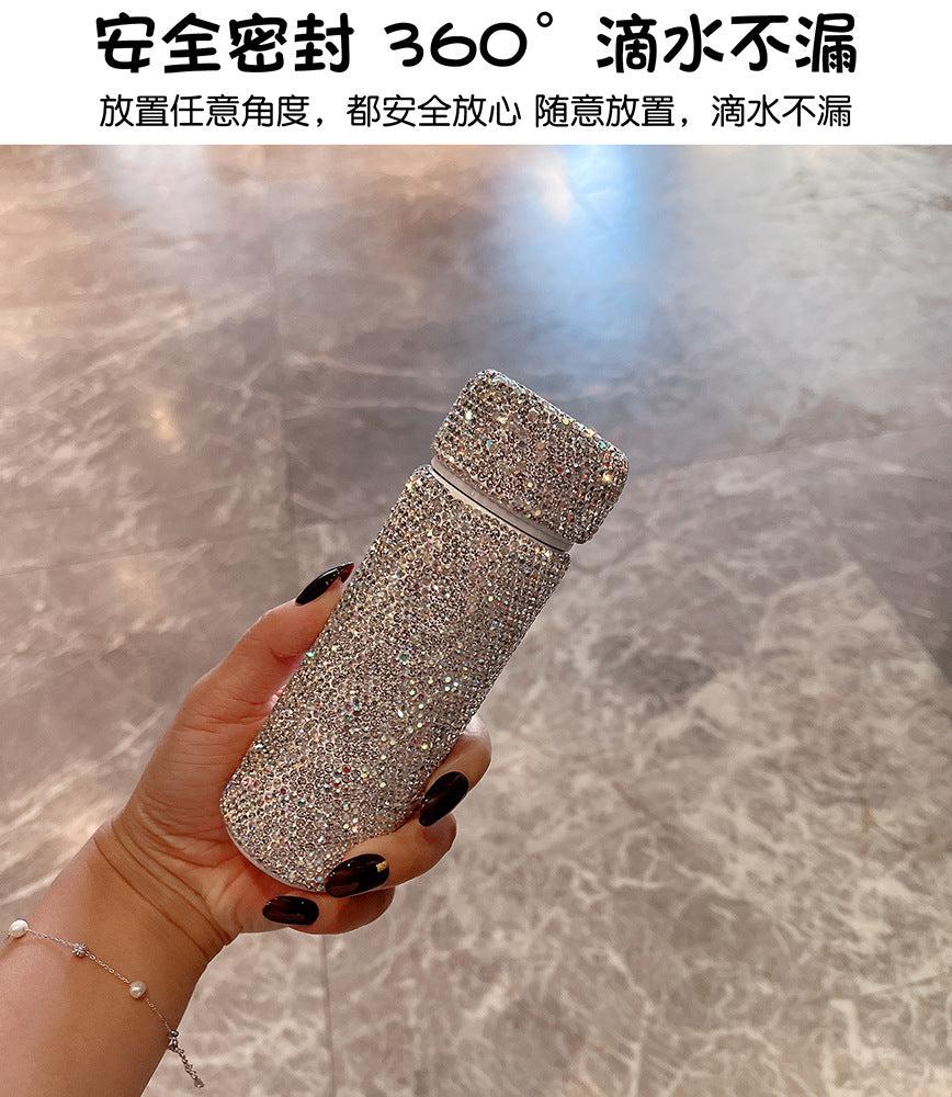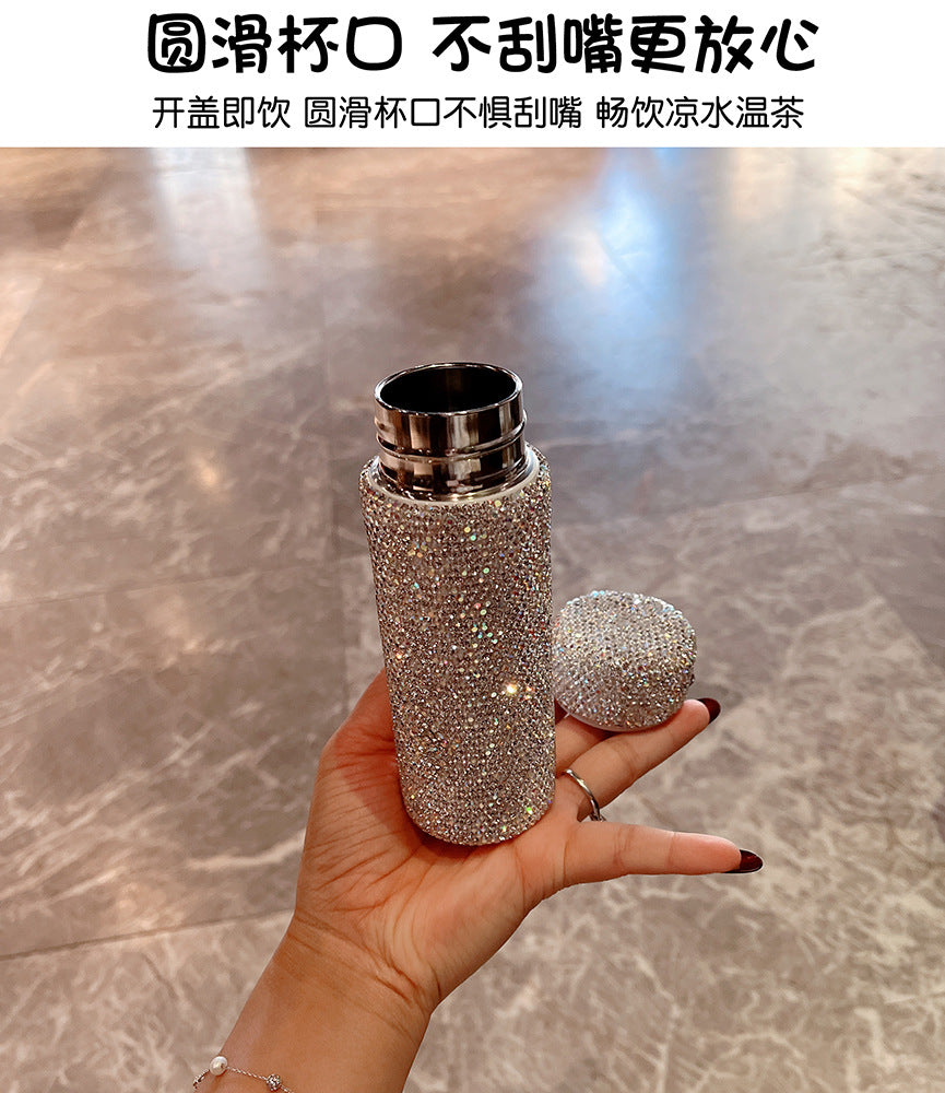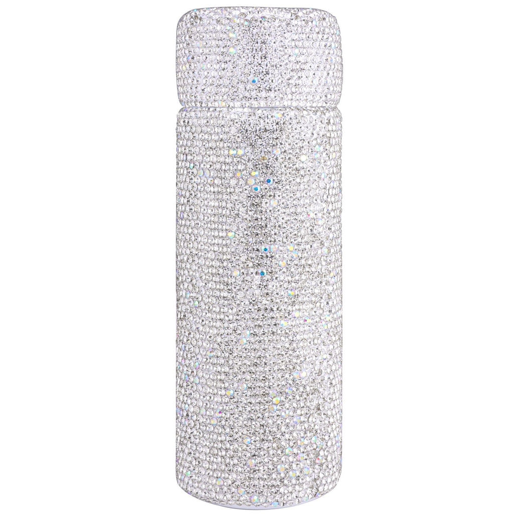 Rinse before first use. Hand wash with mild soap and warm water — avoid abrasive sponges or dishwashers to preserve the finish and crystal setting. Dry thoroughly after washing. Do not microwave or freeze. For best insulation performance, pre-chill with ice water for 2 minutes before adding cold drinks, or pre-warm with hot water before adding hot beverages.