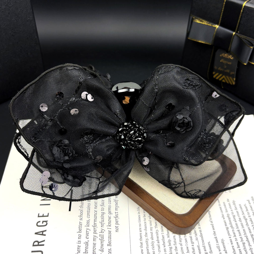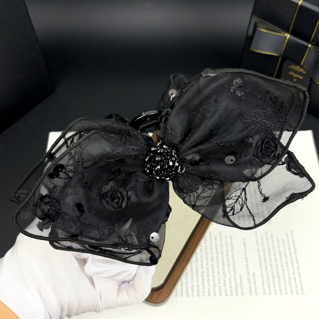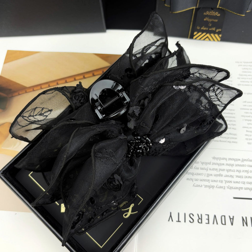 This isn’t just a functional hair clip—it’s a considered accessory that bridges utility and artistry. The wide jaw of the shark clip opens generously to gather volume at the crown or nape, then closes firmly with balanced tension. Its matte black finish complements all hair tones and pairs seamlessly with both casual outfits and polished ensembles. The layered netting element introduces subtle movement and depth, while the hand-tied bow and rose motifs nod to spring-inspired freshness—without feeling overly thematic or seasonal. Whether you're styling a low chignon for work, a half-up look for brunch, or an elegant twist for an evening event, this piece delivers polish with zero effort.
