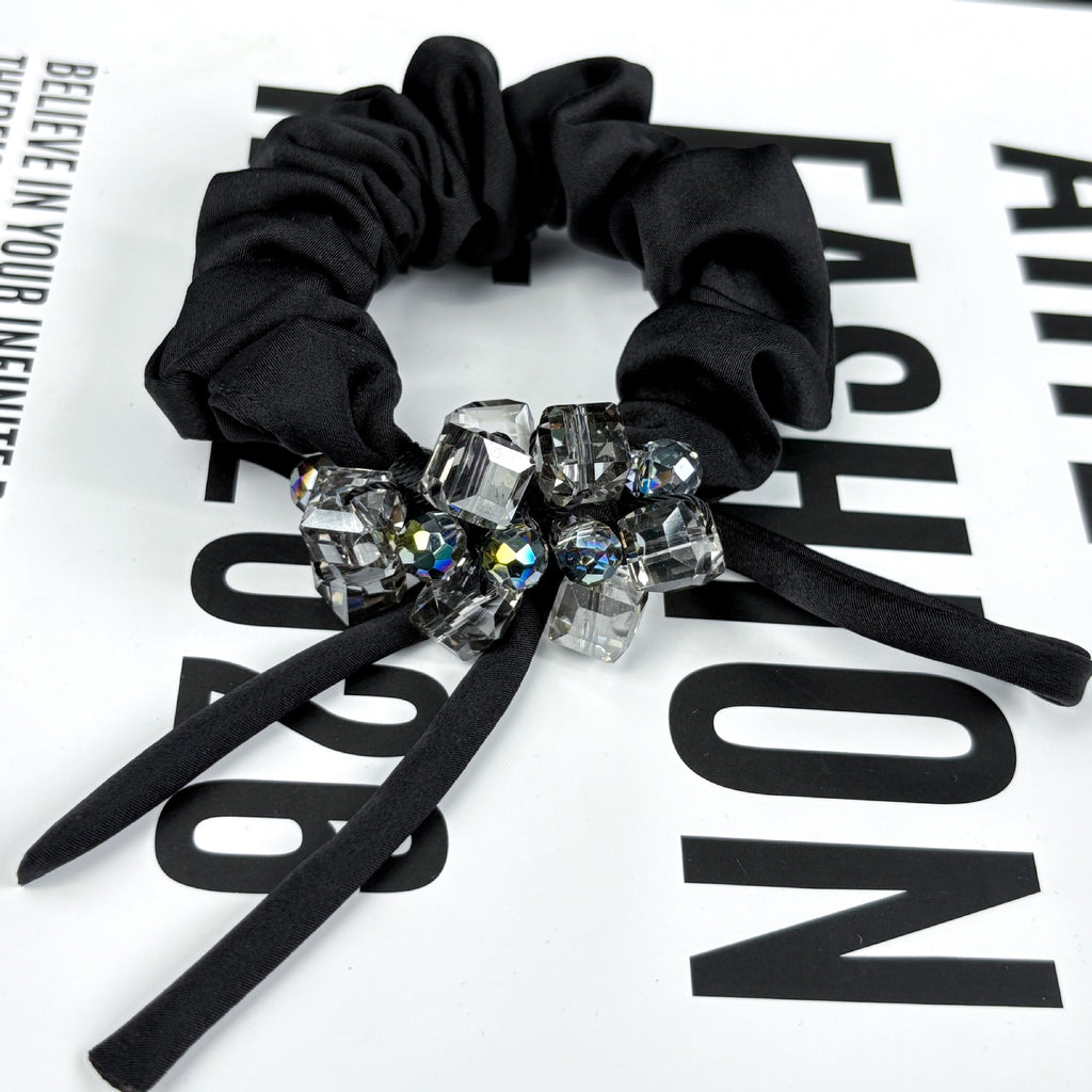 Simply loop around gathered hair for a secure, comfortable hold. To maintain its appearance, avoid contact with perfumes, hairsprays, or moisture-heavy environments. Gently wipe the crystal with a soft, dry microfiber cloth if needed. Store flat or loosely coiled — do not fold sharply at the bow. Hand washing is not recommended; spot-clean only with a damp cloth if necessary.