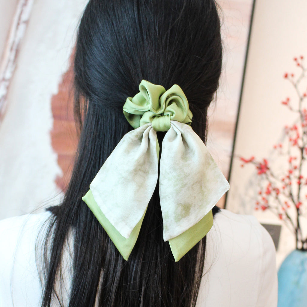 Slide gently onto gathered hair — avoid twisting or over-stretching during application. For longest life, hand-wash occasionally in cool water with mild detergent; air-dry flat away from direct sunlight. Store flat or loosely rolled to preserve bow shape. Avoid contact with perfumes, hairsprays, or rough surfaces to maintain ribbon sheen.