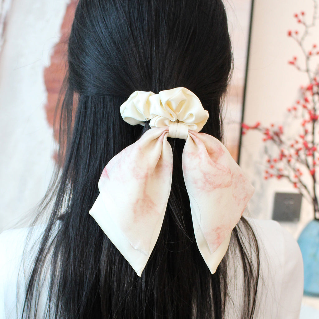 This is not a scrunchie — it’s a structured bow hair tie with a smooth, flat elastic-free base and a separate, sculpted satin bow. It offers cleaner lines, more polish, and better control for sleek styles versus volume-focused scrunchies.