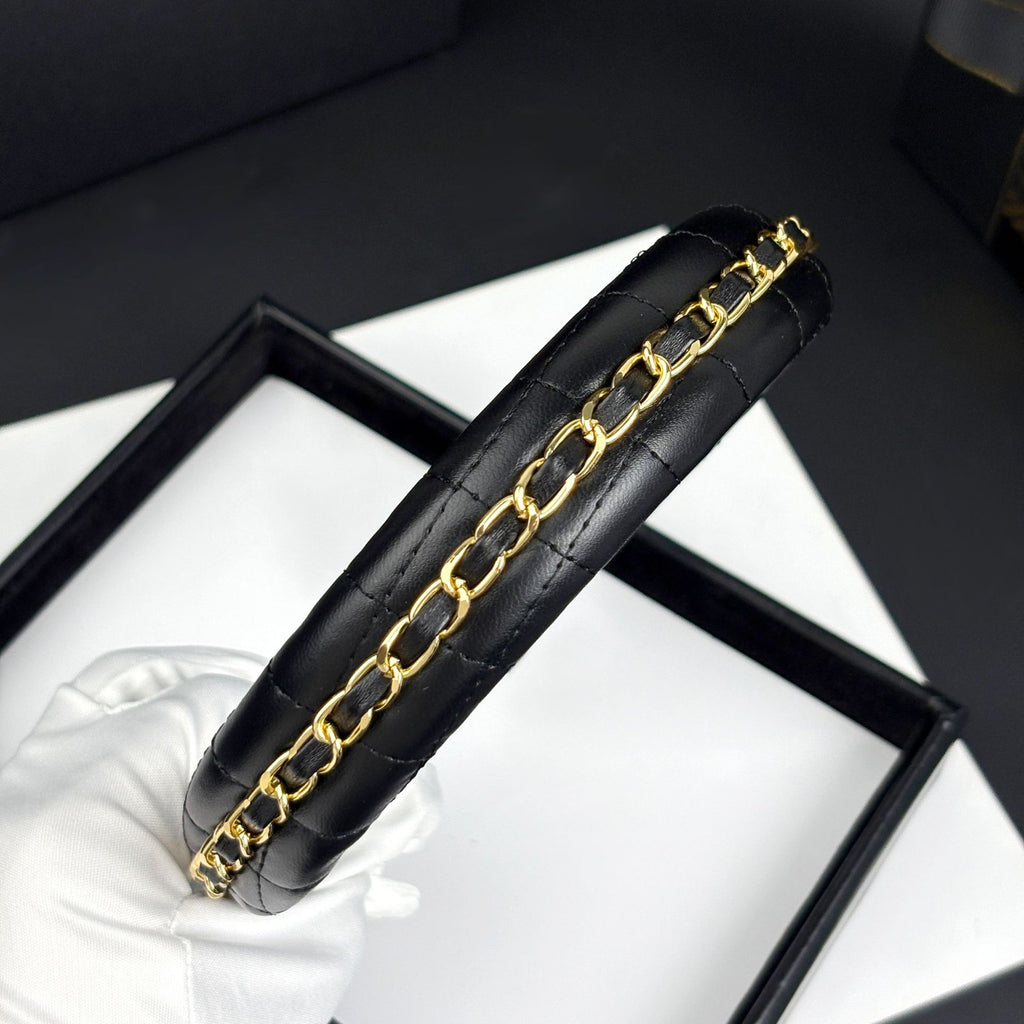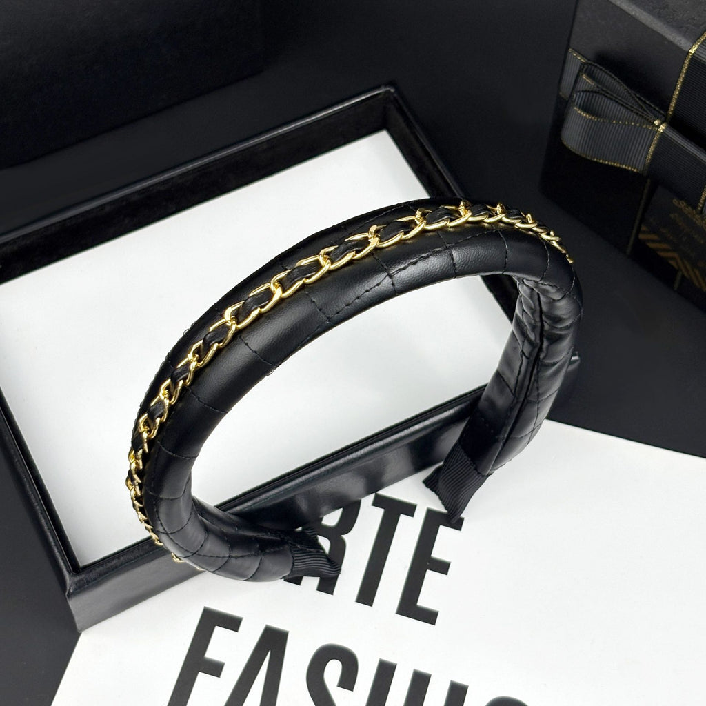 - Rich black leather base with finely detailed metal chain embellishment